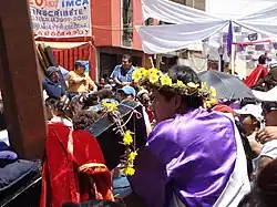 Another important role for the committee is to select the people to play the most important roles, especially the man and woman to play Jesus and Mary respectively.[1][5] Tradition demands that those chosen to play these two roles may not date, drink, smoke or go to parties until they have finished their commitments, along with two newer traditions: no tattoos or piercings. The candidates must also show that they have the economic means to buy the costumes.[10] The candidates are investigated to ensure they meet these requirements.[15] In addition, candidates to play Jesus must also show that they have the physical endurance for the beatings and for carrying of a 100 kilo (220 lb.) cross for four kilometers.[5] Once the chosen candidate passes the two rounds of the selection process, he is then required to remain celibate for the intervening year before the performance, and begin physical training six months in advance.[5][6]