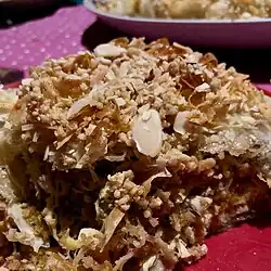 Blanched almonds are fried in oil, then crushed finely and mixed with powdered sugar and cinnamon. In a round baking pan, several pieces of the thin werqa are layered, each brushed with melted butter, and overhanging the edge of the pan. The cook adds the egg mixture, places another buttered sheet of dough over it, adds the shredded meat, also covered with a sheet of dough, and then the almond mixture is added. The overlapping pieces of dough are folded over the filling, and another 2 pieces of buttered dough are added and tucked in around the edges of the pie. The pie is baked until heated through, and the layers of dough are brown. Powdered sugar and cinnamon are sprinkled over the top before serving hot.[19]