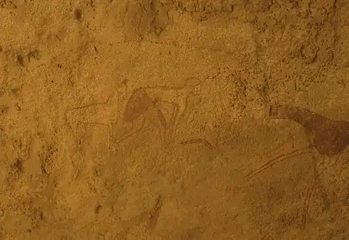 Patina containing an abundant amount of manganese underlie 53% of engraved animal rock art has been found at Wadi al-Ajal, which determines it to be probable that the engraved animal rock art (e.g., elephant, hartebeest, reedbuck, rhino) at Wadi al-Ajal were engraved amid, or even prior to, the Early Pastoral Period and the Middle Pastoral Period.[15] At Wadi al-Ajal, there were ten scattered archaeological sites - nine sites from the Early Pastoral Period and Middle Pastoral Period as well as one site likely from the Pre-Pastoral Period.[15] Numerous engraved Pastoral rock art of animals may reflect an increase in activity (e.g., increased utilization of natural resources) among pastoralists amid the Early Pastoral Period and Middle Pastoral Period.[15]