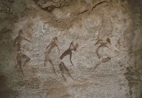 Pastoral rock art is thought to portray Mediterranean and Sub-Saharan African peoples.[2] Most rock art is thought to predominantly depict Mediterranean peoples and depict fewer Sub-Saharan African peoples by 4000 BP.[2] However, other scholars have contested this as Joseph Ki-Zerbo argues this view reflected modern, racial theories which "give prominence to influences from outside Africa [which] are based on flimsy foundations" and rather all African physical types are reflected in the rock iconography.[18][19]