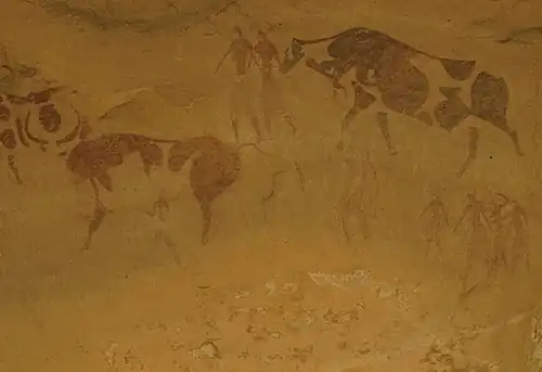 Rather than the domesticating of cattle happening in the region of the Tadrart Acacus, it is considered more likely that domesticated cattle were introduced to the region.[6] Cattle are thought to not have entered Africa independently, but rather, are thought to have been brought into Africa by cattle pastoralists.[25] By the end of the 8th millennium BP, domesticated cattle are thought to have been brought into the Central Sahara.[11] The Central Sahara (e.g., Tin Hanakaten, Tin Torha, Uan Muhuggiag, Uan Tabu) was a major intermediary area for the distribution of domesticated animals from the Eastern Sahara to the Western Sahara.[26]