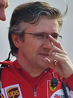 On 22 June 2010, it was announced that Fry was to join the Ferrari team as assistant technical director from 1 July.[7] On 4 January 2011, Ferrari announced that Fry had replaced Chris Dyer as head of race track engineering while retaining his assistant technical director position under Aldo Costa.[8] The change was made following a tactical error in the final race of the 2010 season, the 2010 Abu Dhabi Grand Prix, which cost Fernando Alonso a chance at the title.[9] On 24 May 2011, Costa was moved to an undefined position within the team and Fry was given the job as director of chassis, with the position of technical director being removed outright. Restructuring of Ferrari management made Fry's position one of three—the others being production director (filled by Corrado Lanzone) and electronics director (filled by Luca Marmorini)--to report directly to team boss Stefano Domenicali, who assumed the duties (if not the title) of technical director. On 23 July 2013, Ferrari announced that Lotus technical director James Allison would take over as chassis technical director as of 1 September; Fry remained with Ferrari as director of engineering (a newly created position) and continue to report directly to Domenicali alongside Allison and chief designer Nikolas Tombazis.[10] Ferrari said Fry would leave the team in a restructuring announced 16 December 2014.[11][12]