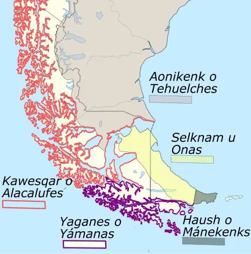 The indigenous peoples of the region included the Tehuelches, whose numbers and society were reduced to near extinction not long after the first contacts with Europeans. Tehuelches included the Gununa'kena to the north, Mecharnuekenk in south-central Patagonia, and the Aonikenk or Southern Tehuelche in the far south, north of the Magellan strait. On Isla Grande de Tierra del Fuego, the Selkʼnam (Ona) and Haush (Manek'enk) lived in the north and southeast, respectively. In the archipelagos to the south of Tierra del Fuego were Yámana, with the Kawéskar (Alakaluf) in the coastal areas and islands in western Tierra del Fuego and the southwest of the mainland.[18] In the Patagonian archipelagoes north of Taitao Peninsula lived the Chonos. These groups were encountered in the first periods of European contact with different lifestyles, body decoration, and language, although it is unclear when this configuration emerged.