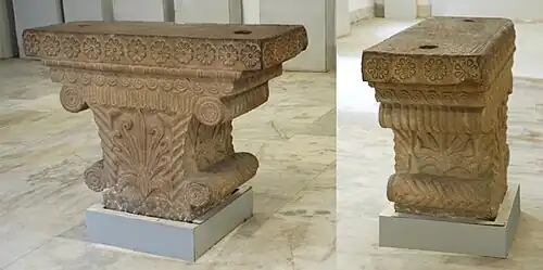 This type of anta capital with side volutes are considered as belonging to the Ionic order, starting from the archaic period. They are generally characterized by various moldings on the front, arranged in a rather flat manner in order not to protrude from the wall, with superposed volutes on curved sides broadening upwards.[23]