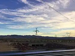 Numerous AC transmission lines parallel Path 27 throughout its course.[68] A 345-kV circuit runs beside the DC line interlinking the IPP and a wind farm near Milford.[4] A second 345-kV circuit leading to the Harry Allen Generating Station joins Path 27 near Cedar City. North of Mesquite, both are joined by a 500-kV line connecting the decommissioned Navajo Generating Station; the three travel somewhat within eyeshot of Interstate 15 until a solar park near Crystal. An assortment of 500-kV transmission corridors then follow Path 27 through Las Vegas Valley toward another collection of solar farms outside Boulder City. From Ivanpah Valley onward, two more 500-kV circuits and a third of 287 kV accompany Path 27 across the desert—these three constitute WECC Path 46.[3]: 197 By Victorville, Path 27 splits from the three AC routes but is once again shadowed by others of various voltages before culminating in Adelanto. Stringing multiple circuits on the same right-of-way is often favored, as it consumes less land per mile.[69]