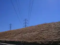 The TANC line changes design at the Olinda substation from the delta pylon pictured at the Interstate 5 crossing[8][9] to the two-level pylon pictured above. This is because much of the segment between the Olinda and Tracy substations was constructed by upgrading an existing double-circuit 230 kV line.[3][10] The segment of TANC's 500 kV line from the Sacramento River crossing south to the Tracy Substation has delta pylons like those found on the Captain Jack-Olinda segment, although they are slightly different.[3] This is because south of the Sacramento River crossing, the original 230 kV line paralleled the two PG&E 500 kV lines almost all the way to Tracy Substation. In order to meet separation requirements, a new alignment for the 500 kV line had to be built some distance to the east, with the exception of the San Joaquin River crossing, which utilizes the former 230 kV facilities. This alignment can be seen from Highway 4 and the western part of the San Joaquin River portion of the Sacramento River Delta. A portion of the former 230-kV line south of the Sacramento River remains in service today as part of the 69 kV system that serves the pumping stations on the Contra Costa Canal.[3]