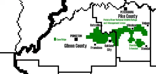 The Patoka River National Wildlife Refuge and Management Area, established in 1994, is a collection of wildlife refuges and habitats situated along the Patoka River in Gibson and Pike counties in southwestern Indiana. It consists mostly of the main body refuge along nearly 40 miles (64 km) of the river's course from just north of Francisco, Indiana, to just west of Velpen, Indiana.[1] Other areas include the Cane Ridge Wildlife Management Area managed by Duke Energy and located immediately south of Gibson Lake and the Gibson Generating Station in northwestern Gibson County, 9 miles (14 km) east of the main body. The refuge is authorized for 23,962 acres (96.97 km2). As of 2010, 6,149 acres (24.88 km2) are owned by the U.S. Fish and Wildlife Service.