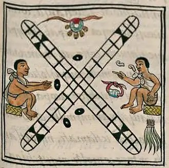Patolli and its variants were played by a wide range of pre-Columbian Mesoamerican cultures and were known all over Mesoamerica: it was played by the Teotihuacanos (the builders of Teotihuacan, ca. 200 BC - 650 AD), the Toltecs (ca. 750 - 1000), the inhabitants of Chichen Itza (founded by refugee Toltec nobles, ca. 1100 - 1300), the Aztecs (who claimed Toltec descent, 1168 - 1521) and all of the people they conquered (practically all of Mesoamerica, including the Zapotecs and the Mixtecs). The ancient Mayans also played a version of patolli. Anthropologists Edward Burnett Tylor (1879, 1896)[4] and E. Adamson Hoebel (1966)[5] remarked on the game's apparent similarities to the South Asian game of pachisi, and a common origin for the games was once considered possible. C. J. Erasmus (1950) criticized the case for common origin as defining "similarity" so broadly as to obscure the differences, while noting that America had a variety of games in which patolli could have arisen independently.[6] He suggested, and R. B. Lewis (1988) further argued, that the similarities reflect the constraints of the board game format.[7]