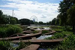 When San Francisco needed a new pump station and holding tank next to the Bay, Johanson was invited to co-design a facility that would be sensitive to the site.[37] She wanted something aesthetic, but also useful in ways beyond mere sewage treatment, so she designed a series of habitats to nourish threatened species.[38] The roof of the sewer is a one-third-mile-long baywalk whose colors and patterns derive from the endangered San Francisco garter snake.[39] The head of the serpent is a 20-foot-high (6.1 m) mound that serves as a microhabitat for butterflies. The Ribbon Worm Tidal Steps fill with water at high tide, creating homes for small marine life.[38]