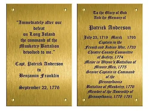 He fought bravely at the Battle of Long Island, Battle of Fort Washington, the Battle of Brandywine and Battle of Germantown. A letter from Anderson to Benjamin Franklin describing the disarray of the Pennsylvania troops after the Battle of Long Island is preserved in the Pennsylvania State Archives.[4][a]