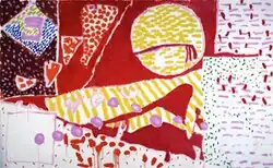Heron's early works were strongly influenced by artists including Matisse, Bonnard, Braque and Cézanne.[33][34] Throughout his career, Heron worked in a variety of media, from the silk scarves he designed for his father's company Cresta from the age of 14,[35] to a stained-glass window for Tate St Ives,[36] but he was foremost a painter working in oils and gouache.[6]