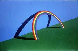 In the 1970s Hughes hung his investigations of perception and illusion on the motif of the rainbow in a series of prints and paintings, such as Pile of Rainbows (1973), Prison Rainbow (1973) and Leaning on a Landscape (1979). Later prints like Leaf Art (1975) and paintings like Realistic Paint (1977) expressed similar interests with colour.[7]