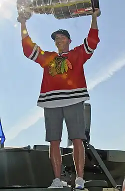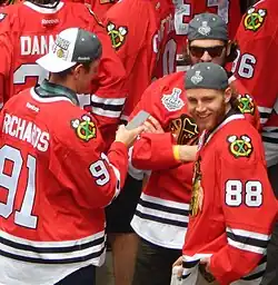 Heading into the 2007 NHL Entry Draft, Kane was ranked second among North American prospects by the NHL Central Scouting Bureau and was chosen first overall by the Chicago Blackhawks.[21] The St. Louis Blues offered to trade the Blackhawks their 9th, 24th and 26th overall picks in the 2007 Draft in order to acquire Chicago's first overall selection and draft Kane.[22] On July 25, 2007, Blackhawks' general manager Dale Tallon announced that they had signed Kane to a three-year contract. Kane threw the ceremonial first pitch at a Chicago Cubs game on June 25, 2007, at Wrigley Field.[23] Kane later joined Denis Savard, the Blackhawks' coach, in singing "Take Me Out to the Ball Game".[23] Kane also threw the first pitch at a Buffalo Bisons (AAA) game in August. Kane chose to wear the No. 88 jersey as a reference to his birthyear, a tradition he practiced with his former teammates on the London Knights.[24]
