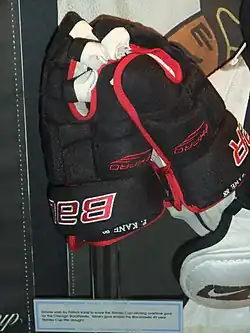 Kane chewed his mouth guard while skating during his early years in the NHL, which became part of his signature on-ice appearance.[137] One of his game-used mouth guards was auctioned for $4,000 at a Blackhawks charity auction, while another is showcased in the Hockey Hall of Fame.[138][139] Other American-born skaters, including Clayton Keller, Matthew and Brady Tkachuk have also followed suit and chewed their mouth guards while playing.[137]