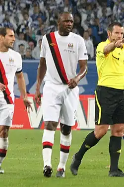 On 8 January 2010, it was confirmed that Vieira was having a medical at Manchester City, and he would sign a six-month deal, where he would link up with former Arsenal colleagues Kolo Touré and Sylvinho, as well as former Inter manager Roberto Mancini. The contract also included an option for a twelve-month extension.[93] Mancini described Vieira as an excellent midfielder with a winner's mentality, and that he would fit into Manchester City's squad very well.[93] He made his debut on 6 February in the 2–1 defeat away to Hull City, replacing Craig Bellamy after an hour. Three days later, he made his first start against Bolton Wanderers, where he assisted Emmanuel Adebayor through a long ball in the 2–0 victory. Later in the month, he was given a three-match retrospective ban for a kick at Stoke City's Glenn Whelan.[94] He scored his first goal for the club against Burnley in a 6–1 win on 3 April 2010.[95] On 9 June, Vieira agreed to a one-year extension to his contract, which kept him at Eastlands until the summer of 2011.[96] On 22 February 2011, Vieira scored the first two City goals in a 5–0 win in the FA Cup Fourth round replay against Notts County, and was awarded Man of the Match honours.[97] He scored in the Premier League on 3 April against Sunderland, a minute after having come on as a substitute for Adam Johnson in the 5–0 win.[98] He made an added-time substitute appearance in place of David Silva on 14 May, as Manchester City won the 2011 FA Cup Final with a 1–0 win over Stoke at Wembley.[99] On 14 July, he retired at the age of 35, immediately becoming a development executive at City.[100]