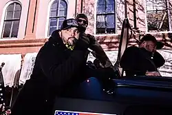 ![]() Joey Gibson, founder of Patriot Prayer, at a 2017 Seattle rally with Proud Boys members | |