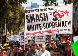Prior to the violence at the Unite the Right rally in Charlottesville, Virginia, Patriot Prayer's rallies featured "right-wing nationalists".[58][59] Since Charlottesville, the group has tried to distance themselves from the alt-right.[60][61] Rose City Antifa organized opposition to Patriot Prayer rallies in Portland.[62]