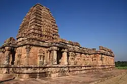 The Papanatha temple is situated apart from the main cluster of eight monuments. It is about half kilometer to the south of Virupaksha and has been dated towards the end of the Early Chalukya rule period, approximately mid-8th century.[65][66] The temple is noted for its novel mixture of Dravida, and Nagara, Hindu temple styles.[66][67]
