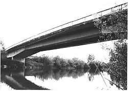 Built in 1950, the Patton Bridge spans the Green River near the city of Auburn in King County, Washington. The bridge is a three-span cantilever with two anchor arms, two cantilever arms and a suspended section. It includes a combination of concrete and steel box girders. The bridge was designed by Homer M. Hadley, a consulting engineer from Washington State.[2] The anchor arms and cantilever arms are multiple box, two-cell reinforced concrete box girders. The suspended section consists of two spread, welded steel box girders with reinforced concrete deck. The concrete deck is fixed to the top flange plate of the girders with steel shear developers. Utilization of this deck design allows the concrete deck and steel box girders to act in composite design; i.e., the bottom flange of the steel box resists tensile forces while the concrete deck resists compressive forces.[2] The Patton Bridge's anchor arms are 115 feet (35 m) feet long, the cantilever arms are 50 feet (15 m) long, and the suspended span is 100 feet (30 m). The bridge has a total length of 430 feet (130 m). The center span of 200 feet (61 m) is the longest box girder span constructed in the state during the 1940s.[2]