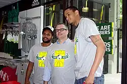 During the 2010–11 season, the "3 Goggles" trend became popular in the NBA, whereby players fit themselves with "A-OK" hand-gesture goggles after they make a three-point basket during a game. Mills and teammate Rudy Fernández are credited with having started the trend. Mills and his teammates would poke fun at Fernández's struggles from beyond the three-point line, indicating he could not see very well. So when Fernández started sinking three-point shots, they would make goggles with their hands over their eyes in tribute to his skill. From Fernández's perspective, when he started to make three-point shots, he would make the goggle gesture to show Mills his vision was OK.[102][103] T-shirts with the gesture were printed and popularly sold in Portland.[104]
