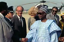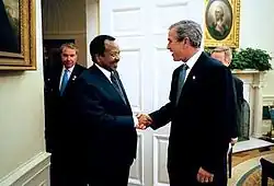 Cameroon–U.S. economic relations were at their highest ever level in 1982, when Ahidjo was replaced by his prime minister, Biya. Between 1982 and 1984, the U.S. overtook France as Cameroon's foremost export market, primarily due to its consumption of Cameroonian oil.[56] Biya pursued a diversification of Cameroonian foreign relations still more vigorously than Ahidjo had, describing his foreign policy in such terms as "diplomacy of development", "co-operation without frontiers", and "open door" diplomacy.[56]