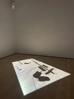 In 2005, Chan began 7 Lights a series of large-scale projected animations based on the Biblical seven days of Creation. In a formal break with his previous animations, Chan designed 7 Lights to be projected on the walls and floor of its venue, instead of on a rectangular screen.[8] The animations forgo the hard-edged color and line of the previous animated works and are instead composed solely of light and moving shadows in the shapes of humans, animals, and consumer goods. In 2007, Chan debuted all seven of the projections of the 7 Lights series at the Serpentine Gallery in 2007. The projections were accompanied by charcoal drawings and collages of the projections of the series re-imagined as musical scores.