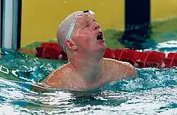 Australian S14 swimmer Paul Cross gasps for breath at the end of a race at the 1996 Atlanta Paralympic Games
