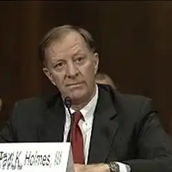 In December 2009, Arkansas senators Mark Pryor and Blanche Lincoln recommended Holmes to become a federal district judge. On April 28, 2010, President Obama nominated Holmes to the seat on the Western District of Arkansas that was vacated when Judge Robert T. Dawson assumed senior status on August 14, 2009.[7] Holmes' nomination lapsed at the end of 2010, and he was renominated by Obama on January 5, 2011. The United States Senate Committee on the Judiciary voted to advance Holmes' nomination to the full United States Senate on February 3, 2011.[7] The United States Senate confirmed Holmes' nomination on February 7, 2011 by a 95–0 vote.[8] He received his commission on February 8, 2011.[5] He served as Chief Judge on February 14, 2012, until February 14, 2019.[5] Holmes assumed senior status on November 10, 2021, his 70th birthday.[5]