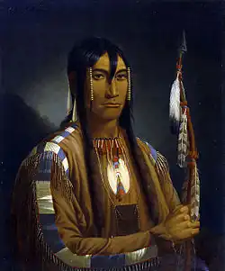Kane began a career as a sign and furniture painter at York until he moved to Cobourg, Ontario, in 1834. He may have taken up a job in the furniture factory of Freeman Schermerhorn Clench, the father of Harriet Clench who Kane married in 1853.[5][6][4] While in Cobourg, Kane painted several portraits of the local personalities, including the sheriff and his employer's wife.[8] In 1836 Kane moved to Detroit, Michigan, where the American artist James Bowman was living. The two had met earlier at York. Bowman had persuaded Kane that studying art in Europe was a necessity for an aspiring painter, and they had planned to travel to Europe together, along with Samuel Bell Waugh.[9] But Kane had to postpone the trip, as he was short of money to pay for the passage to Europe and Bowman had married shortly before and was not inclined to leave his family. For the next five years, Kane toured the American Midwest, working as an itinerant portrait painter, travelling to New Orleans.[10]