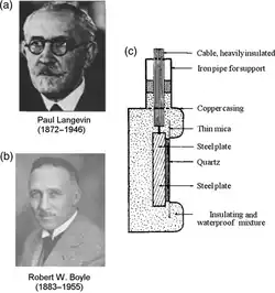 Langevin is noted for his work on paramagnetism and diamagnetism, and devised the modern interpretation of this phenomenon in terms of electron spin.[6] His most famous work was in the use of ultrasound using Pierre Curie's piezoelectric effect. During World War I, he began working on the use of these sounds to detect submarines through echo location,[3] though the war ended before the system became operational. During his career, Paul Langevin also spread the theory of relativity in academic circles in France and created what is now called the twin paradox.[7][8]