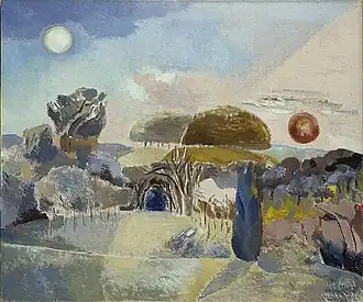 From 1942 onwards, Nash often visited the artist Hilda Harrisson at her home, Sandlands on Boars Hill near Oxford, to convalesce after bouts of illness. From the garden at Sandlands, Nash had a view of the Wittenham Clumps, which he had first visited as a child and had painted both before World War I and again, as a background, in 1934 and 1935. He now painted a series of imaginative works of the Clumps under different aspects of the Moon. Paintings such as Landscape of the Vernal Equinox (1943) and Landscape of the Moon's Last Phase (1944) show a mystical landscape rich in the symbolism of the changing seasons and of death and rebirth.[46][47] Another place in South Oxfordshire that Nash visited and revisited and found inspirational in his study of the Moon was the hamlet of Ascott.[48] There he began in 1932 and completed in 1942 his painting Pillar and Moon, which explored "the mystical association of two objects which inhabit different elements and have no apparent relation in life...the pale stone sphere on top of a ruined pillar faces its counterpart the moon, cold and pale and solid as stone".[49]