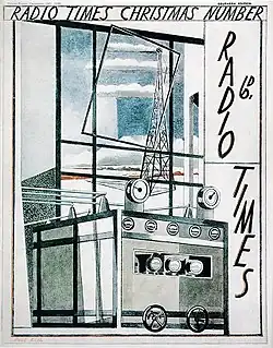 In 1921, after visiting his sick father, Nash collapsed and, after a week during which he repeatedly lost consciousness, was diagnosed as suffering from 'emotional shock' arising from the war.[6] To aid his recovery, the Nashes moved to Dymchurch which they had first visited in 1919 and where he painted seascapes, the seawall and landscapes of Romney Marsh.[12] The seawall at Dymchurch became a key location in Nash's work.[22] The conflict between land and sea depicted in the seawall paintings at Dymchurch recalled elements of Nash's paintings on the Western Front and were also influenced by his grief at the death of his friend Claud Lovat Fraser in June 1921. In 1922, Nash produced Places, a volume of seven wood engravings for which he also designed the cover, cut the lettering and wrote the text. At this time he also began painting floral still-lifes as well as continuing his landscape paintings, most notably with Chilterns under Snow in 1923.[6] Throughout 1924 and 1925 Nash taught part-time at the Design School at the Royal College of Art, where his students included both Eric Ravilious and Edward Bawden. In 1924 he held a commercially successful exhibition at the Leicester Galleries. This allowed the Nashes to spend the winter near Nice and visit Florence and Pisa at the start of 1925 after which they moved home to Iden near Rye in Sussex. Iden and the Romney Marshes became the settings for a series of paintings by Nash, most notably Winter Sea painted in 1925 and reworked in 1937.[6] In 1927 Nash was elected to the London Artists' Association and in 1928 held another successful exhibition of his paintings at the Leicester Galleries whilst an exhibition of his wood-engravings was held at the Redfern Gallery the same year.[12] The Leicester Galleries exhibition was notable for showing Nash turning away from his popular landscapes and beginning to explore abstraction in his work.[12]