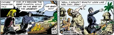 One of the many highlights of Ryan's time on The Phantom is the daily adventure that ran from August 24, 2009, until May 7, 2011. Called by DePaul in its entirety "The Death of Diana Palmer Walker", this epic storyline was considered at that time to be the longest in duration of all The Phantom newspaper plots. The recurring villain of the tale, Chatu, a.k.a. the Python, is a ruthless terrorist who seeks revenge on his nemesis by striking at someone close to the Phantom. Frew Publications later presented the entire story as "The Python Strikes Back," which comprised the 140-page issue number 1602 of their long-running reprint series The Phantom. (In May of 2021, DePaul and Manley began an adventure called To Wrack and Ruin at Gravelines, which was the first part of a much larger story that subsequently surpassed "The Death of Diana Palmer Walker" in length.)[26]