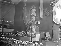 After a purge of political leadership enforced by Moscow under the leadership of Kees Schalker, De Groot joined the party board of the CPN in February 1930. Because of his activist past, great readability (besides Karl Marx he also read Heinrich Heine), intelligence, journalistic qualities and tactical insight, he stood head and shoulders above his fellow directors. This and his almost slavish loyalty to Stalin led to De Groot becoming political secretary of the party in 1938, which had since been renamed Communist Party of the Netherlands. He formed the party presidency with Lou Jansen and Jan Dieters. He also became editor-in-chief of the newspaper Het Volksdagblad. He turned out to be a headstrong, often capricious and suspicious leader. By the late 30s he was seen as the de-facto leader of the CPN, but this was not publicly announced and the position of chairman was retained by Ko Beuzemaker.[1]