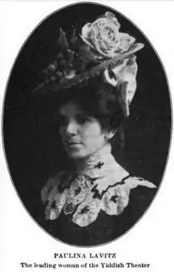 Paulina Lavitz was a "leading woman" in Yiddish theatre, in Chicago and New York.[3][4] In Chicago she starred at International Theater with David Silbert in Queen Sabba in 1907,[5] and appeared with Regina Prager and Fernanda Eliscu at the Metropolitan Theatre in 1909.[6]