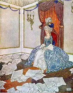 According to Lewis, she had "Magna virtutes nec minora vitia" – great virtues, but vices no less great.[49] He felt that the faces of her children were often "empty, expressionless and too alike",[48] and that she couldn't draw lions.[48] Indeed, "In quadrupeds claudicat" (she limps); he wrote that she would profit from a visit to a zoo.[55] He noted that a knight was wearing his shield on his right arm instead of his left.[55] "What", he asked I. O. Evans, "is one to do with illustrators – especially if, like, mine, they are timid, shrinking young women who, when criticized, look as if you'd pulled their hair or given them a black eye? My resolution was exhausted by the time I'd convinced her that rowers face aft not (as she thinks) forward."[54]