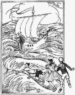 In 1974, a year after Tolkien's death, Allen & Unwin published his poem Bilbo's Last Song as Baynes's third and final Tolkien poster. Her painting showed a scene that Tolkien described in the closing pages of The Lord of the Rings: Sam, Merry and Pippin stand at the Grey Havens, watching an elvish ship carrying Frodo, Bilbo, Elrond, Galadriel and Gandalf away from Middle-earth to the land of Aman.[35] In 1990, the poem was reissued as a book with three parallel sequences of Baynes's paintings: one illustrating Bilbo's journey from Rivendell to the Undying Lands, one showing Bilbo in various states of repose, and one depicting the events narrated in The Hobbit.[36] Some of the illustrations were omitted when the book was reissued by other publishers twelve years later.[37]