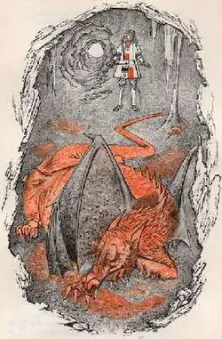 In 1978 Baynes painted a cover for a paperback edition of Tolkien's translations of Sir Gawain and the Green Knight, Pearl and Sir Orfeo.[38] In 1980 Allen & Unwin published Poems and Stories, a de luxe, boxed, single-volume anthology of several of Tolkien's shorter works.[39] The book featured new illustrations by Baynes for the short story Leaf by Niggle, the verse drama The Homecoming of Beorhtnoth Beorhthelm's Son, Farmer Giles of Ham, The Adventures of Tom Bombadil and Smith of Wootton Major. It also included all of Baynes's original illustrations for the latter three titles, some revised with grey and orange tinting. Baynes used the opportunity provided by revisiting Tom Bombadil to rework her illustration for The Hoard to make its dragon and knight look the way Tolkien had wanted them to.[14]