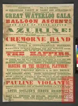 Edward Tyrrel Smith paid her to attempt to cross the Thames in Albanian costume on 12 August 1861. A wire that was too slack meant that she failed at the first attempt but she succeeded at her second try.[1] She walked from Battersea Bridge to the Cremorne Gardens watched by 20,000 people.[2] The Illustrated London News carried an engraving showing the number of boats that came out to observe the spectacle. She was advertised as Madam Blondin.[1]