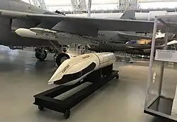 Pave Knife was developed in 1969 to replace the original, essentially improvised Airborne Laser Designator (ALD) and TRIM pod (see A-6 Intruder).[1] ALD was not a pod but a hand-held laser operated by the weapon systems officer to mark targets for Paveway laser-guided bombs. Pave Knife was a roughly banana-shaped external pod, weighing about 550 kg (1,200 lb), containing a steerable laser and closed-circuit television camera. The weapon systems officer or bombardier/navigator (BN) monitored the TV image with a small Sony TV in the cockpit and steered the laser onto the target with a hand controller, then passing the target information to the aircraft's gun sight.