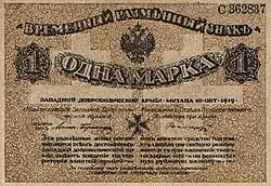 After the disbandment of general Rüdiger von der Goltz's German Baltic volunteer corps, the German troops were ordered to retreat from the Baltics and return home, however Goltz and the soldiers refused in hopes of gaining land and citizenship in Latvia as was promised to them by the Latvian government. Avalov was later appointed the "commander of all Russian units formed in Courland and Lithuania" by Yudenich. Avalov's army numbered some 50,000 men at this point - 40,000 of them being German or Balto-German and 10,000 being Russian. Since the German government stopped paying for the troops, finances were mostly coming from German economic leaders that had interests in the Baltics, as well as J. P. Morgan Jr. and the Order of St John. Avalov's army also printed its own money.[10] The army was marked by internal disagreements between Avalov and Vyrgolich.[11][12]