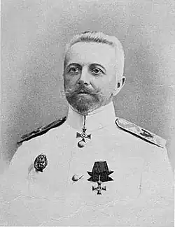 Prince Pavel Petrovich Ukhtomsky (Russian: Па́вел Петро́вич Ухто́мский 10 June 1848 – 14 October 1910) was a career naval officer in the Imperial Russian Navy, noted for his action at the Battle of the Yellow Sea in the Russo-Japanese War of 1904-1905. He was held in scant respect by his colleagues, who felt that his rank and position was owed more to familial connections than any competence or ability.[1] Lt. Commander Newton A. McCully, the American naval attaché in Port Arthur through much of the siege noted that Ukhtomsky "was not esteemed as particularly able, but was considered a Russian patriot, and had the credit with the fleet of having forced Admiral Vitgeft to make the sortie of June 23"[2]