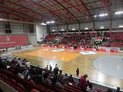 It has a full capacity of 1,800 seats and is mainly used by the handball and volleyball departments of the club. Its construction ran at the same time as the adjacent arena, Pavilhão Fidelidade, but it was finished just a couple weeks later.[1] Because the old Pavilhão da Luz was at full capacity with five sports, Benfica planned the new Estádio da Luz with two indoor arenas; the smaller one only hosting two departments.[2] Its differences from the main arena are its roof and its two side stands, who sit fewer people.