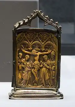 Paxes with elaborate metalwork framing an image in a medium that would withstand kissing and wiping are the sort that have been most likely to survive. Other objects that might seem to have had another purpose, such as plaquettes, ivory panels or small painted enamel plaques, may have been made for a pax. Equally other objects began life as serving some other purpose, and were turned into paxes.[26] Some still have a metal fitting at the rear, either a handle or a slot for a long wooden handle to fit into, of which a few have survived. Glass or rock crystal over an image below allowed the image to be kissed repeatedly but not damaged, and enamel also wore relatively well. Carved shell and mother of pearl are sometimes used. Even with a frame paxes are usually less than a foot high, and the images often 4 to 6 inches (100 to 150 mm) high. The inventory of the royal treasure of King Richard II of England lists many paxes among its nearly 1,200 items, including two of plain ungilded silver with red crosses, which Jenny Stratford suggests were for use in Lent. Several record who gave them, or from whom they were seized for offences.[27]