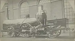 The "Pays de Waes" is the second locomotive in a series of nine machines designed by the Belgian engineer Gustave De Ridder. Built in his private workshops, the locomotive was put into service on a narrow gauge line (Anvers-Saint-Nicolas-Lokeren-Gand) that was operated by the Compagnie du chemin de fer d'Anvers à Gand par Saint-Nicolas et Lokeren (a private company) in 1845,[4] a narrow gauge line ( 1,151 mm (3 ft 9+5⁄16 in) vs 1,435 mm / 4 ft 8+1⁄2 in).[5][6] The locomotive reached a speed of 60 km/h (37 mph) in 1844, the year of its construction. [7]