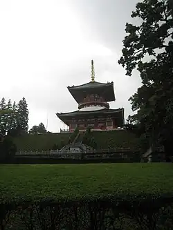 Work on Hanaokayama Peace Pagoda, the first Peace Pagoda constructed by Nipponzan Myohoji Japanese Buddhist monks, began in 1947 atop Mount Hanaoka, Kumamoto (32°47′48″N 130°41′09″E / 32.796605°N 130.685959°E) with basic hand tools.[7] It took seven years to build, being inaugurated in 1954: it was the first of over 80 built by Fujii and his followers all over the world.[8]