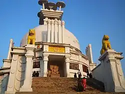 The Rajgir Vishwa Shanti Stupa/World Peace Pagoda (25°00′16″N 85°26′40″E / 25.004553°N 85.444539°E) was completed in 1969 at Rajgir hills near Rajgir, near the Vulture's Peak where the Buddha is believed to have preached the Lotus Sutra.[2] The dedication coincided with the 100th anniversary of the birth of Mahatma Gandhi. The site also includes a Nipponzan Myohoji temple.[3]
