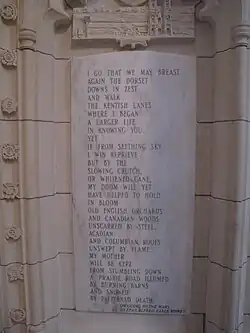 Amidst the carved marble plaques detailing Canadian military involvement since Confederation, five marble plaques on display in the Memorial Room present literary passages. Two plaques contain (in English and French) "In Flanders Fields" by Canadian physician Lieutenant-Colonel John McCrae. One plaque has an excerpt from French-Canadian author Gabrielle Roy's novel Bonheur d'occasion (The Tin Flute). Psalm 139:8-10 from the Bible is etched on another plaque in both French and English. A fifth plaque is inscribed with the moving poem "On Going to the Wars" by Canadian writer Earle Birney: