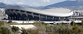 The Peace and Friendship Stadium opened in 1985,[9] and its construction cost was €25,000,000 in 1983 prices. It was designed by the architectural firm "Thymios Papagiannis and Associates" and had a capacity of 14,940.[10] The arena is built opposite to the Karaiskakis Stadium, located in the western end of the Phaleron Bay. It was inaugurated on February 16, 1985, at the first Panhellenic Athletics Indoor Championship, and hosted the 1985 European Athletics Indoor Championships in March.[11] Originally it was designed and operated for a dual use as an ice hockey rink and as basketball stadium. The first Greek Ice Hockey Championship was held in the stadium in 1989. The operation of the skating rink was stopped for the use of other sports.
