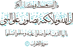 20. ^ "إن ٱلله وملـئكتهۥ يصلون على ٱلنبيۚ يـأيها ٱلذين ءامنوا صلوا عليۡه وسلموا تسۡليما" [Indeed, Allah and His angels send blessings on the Prophet. O you who have believed, send blessings on him and salute him with a worthy salutation] (in Persian). Retrieved 21 December 2024.